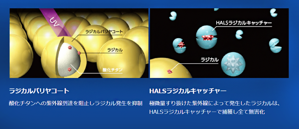 また、上記同様にラジカル制御機能もあるため、高耐候性で、期待耐用年数が15~18年と長く保つ塗料です!